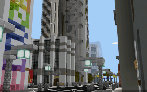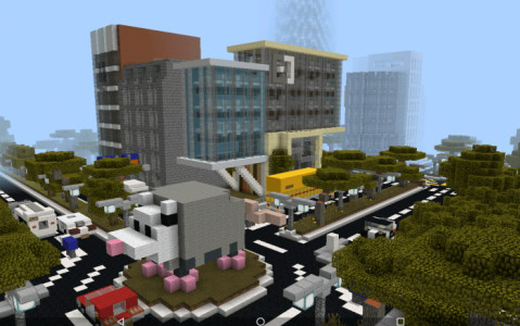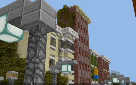 На карте объединенными усилиями был построен современный город в игровом мире minecraft PE. Скачайте её чтобы исследовать, побродить по улицам, дорогам, посетить здания и осмотреть творения.
