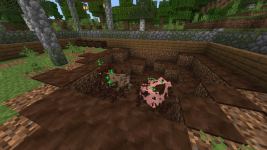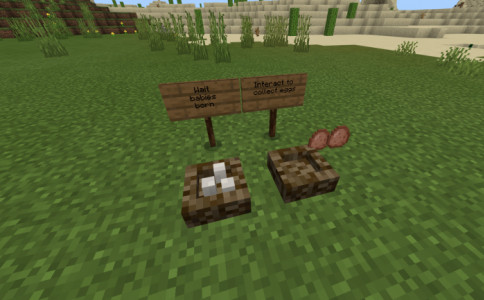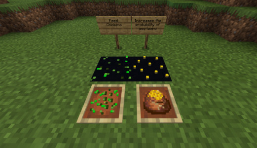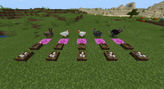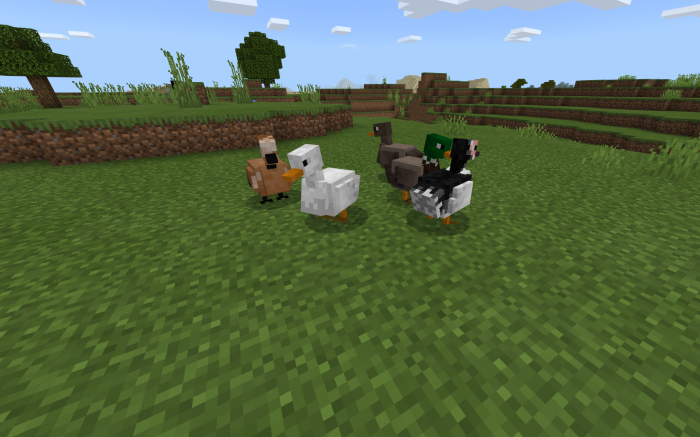 Данные мобы представлены всеми известными вариантами, среди которых будут Цесарки, Куры, Гуси, ну и конечно же, Индюшки всех полов. Для получения потомства снабжайте птиц кормом в виде семян. Также с них можно получить яйца и питательное мясо.