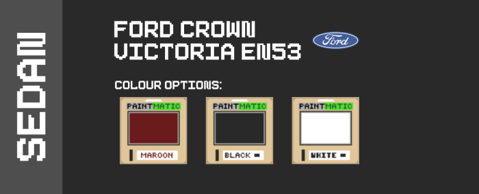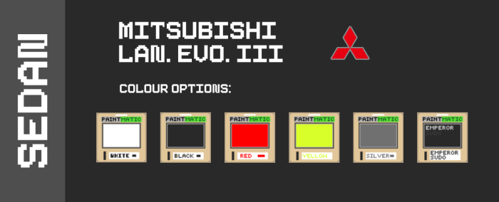 Модельный ряд включает: Ford Crown Victoria, Mitsubishi Lancer Evolution III, BMW E30.