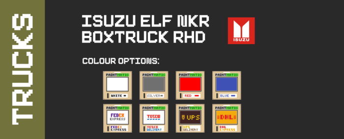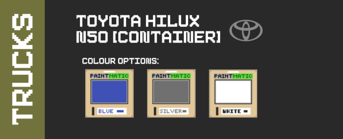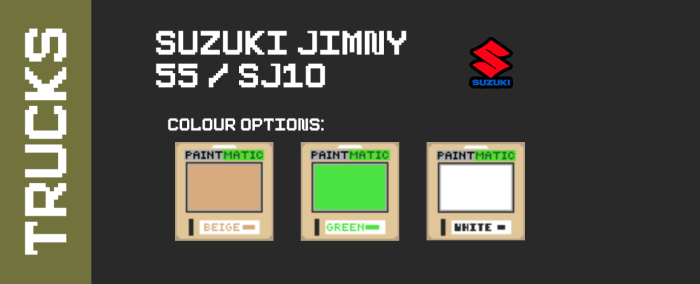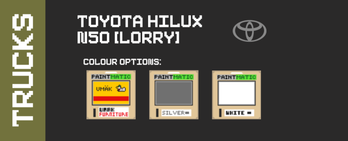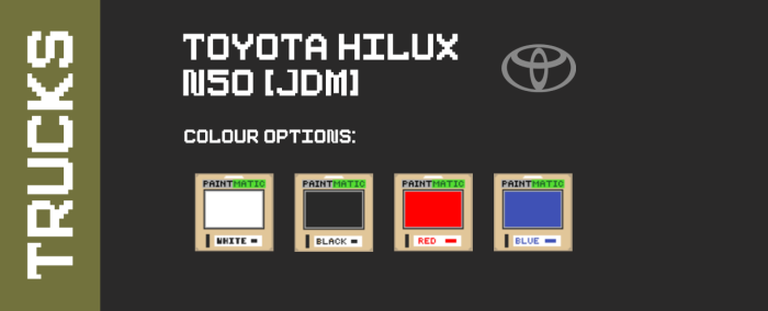 Модельный ряд включает: Isuzu Elf NKR, Toyota Hilux N50, Toyota Hilux N50, Suzuki Jimny 55.