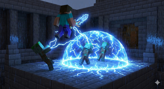 Удар током: Подбрасывает вас в воздух, а при падении создает электрический купол, который поджаривает всех мобов в радиусе 5-7 блоков.
