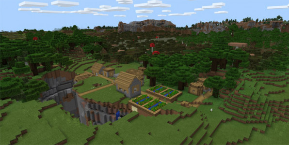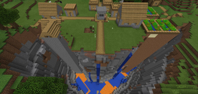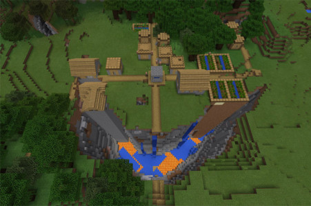 В этом мире игрок появится почти сразу возле этой деревни. Она очень интересная, потому что ещё бы чуть-чуть, и вся деревня упала бы в это ущелье и мирные жители погибли в нем. Но им повезло, это поселение стоит прямо на краю пропасть. Смотрите на картинках внизу как это выглядит в игровом мире minecraft.